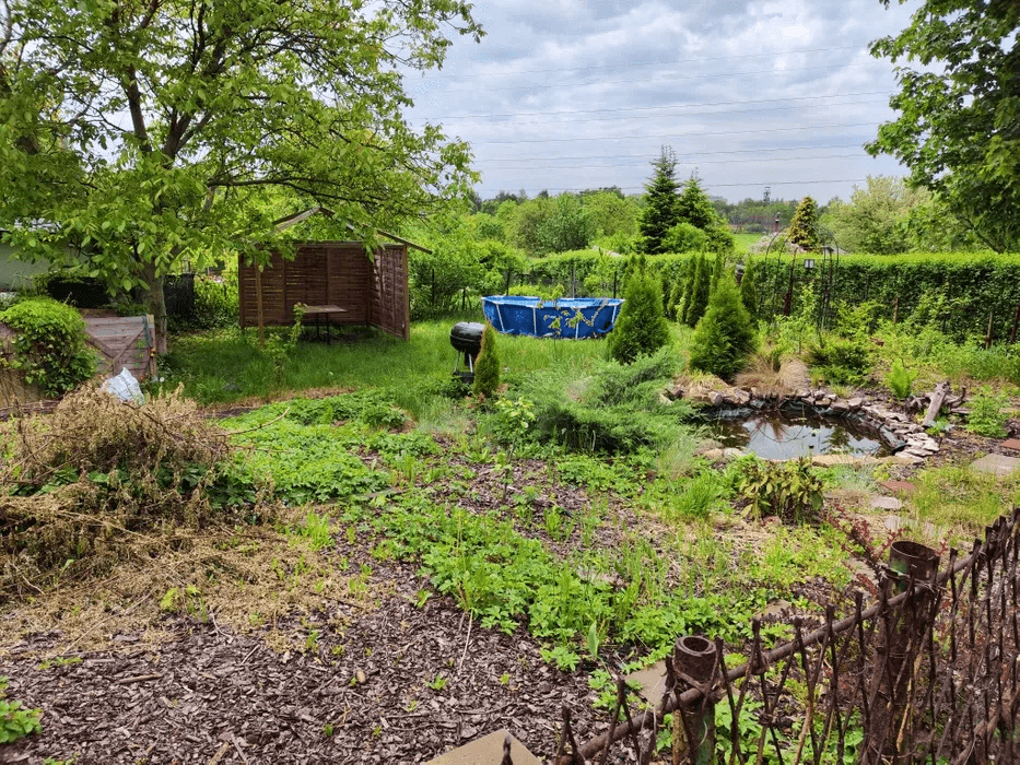 Ogródek o powierzchni 307m2 posiada przyłącze wody prądu brak ale jest możliwość podłączenia, liczniki znajdują się na przeciwnej działce, mam kupiony nawet kabel więc wystarczy się tylko podłączyć. Wcześniej na ogródku prąd był ale podczas prac ziemnych kabel został przerwany nie wiadomo w którym miejscu. W altanie wyprowadzona instalacja z gniazdkami i światłem. Altana do generalnego remontu, posiada trzy pomieszczenia, oprócz tego komórka na kosiarki grabie i inne niezbędne przyrządy. Na ogródku dużo nowych nasadzeń między innymi porzeczki które obficie owocują co roku czereśnia jabłka grusza orzech. Basen, który stoi na ogródku zostaje, wystarczy wyczyścić i w upały można się kąpać. Wykopane oczko przy którym można wieczorem siąść i się zrelaksować.