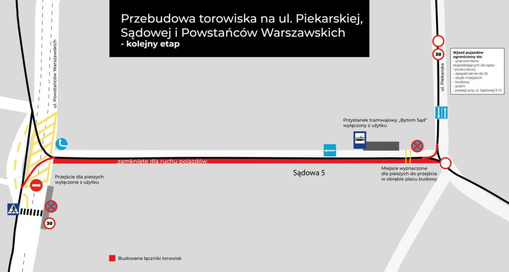 - w rejonie skrzyżowania z ul. Sądowej z ul. Piekarską powstanie tymczasowe przejście dla pieszych umożliwiające dojście w kierunku pl. Kościuszki i dalej w kierunku ul. Powstańców Warszawskich;