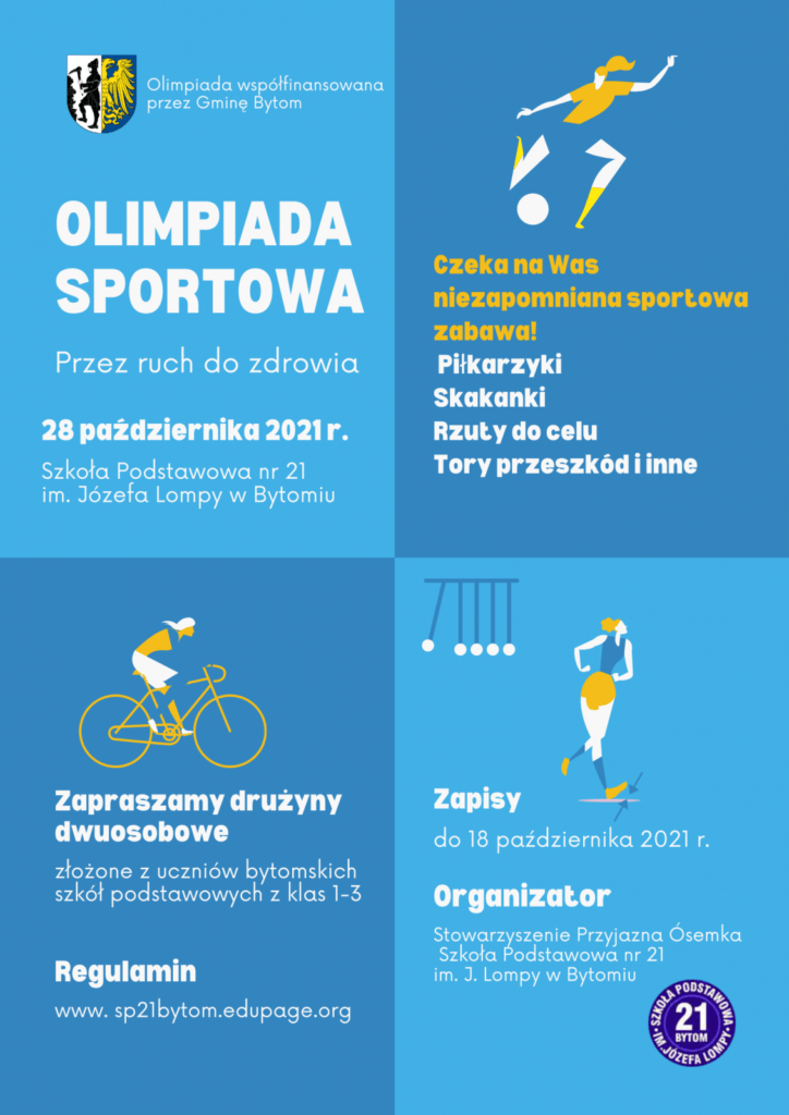 Organizator zaprasza drużyny dwuosobowe złożone z uczniów bytomskich szkół podstawowych z klas 1-3. Zapisy na Olimpiadę sportową zaczną się od 18 października. Organizatorem jest Stowarzyszenie Przyjazna Ósemka – Szkoła Podstawowa nr 21 im. J. Lompy w Bytomiu. Regulamin znajduje się na stronie internetowej www.sp21bytom.edupage.org