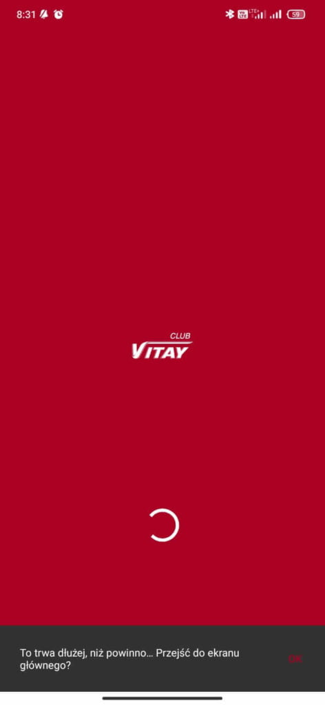 Dzisiaj próbowaliśmy się zalogować na aplikację VITAY, bo jesteśmy szczęśliwymi posiadaczami karty ze stacji paliw Orlen. Niestety, już na wstępie uzyskujemy komunikat, że aplikacja się zbyt długo ładuje i czy chcemy przejść do ekranu głównego.