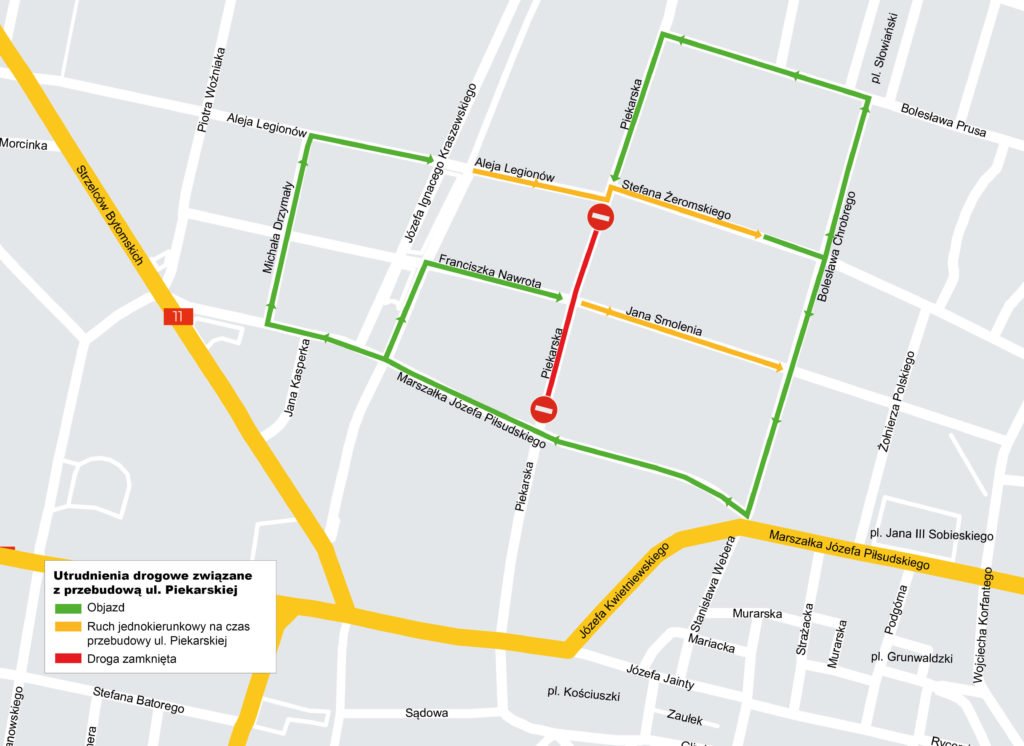 Od soboty – 23 lipca zamknięty jest ruch kołowy na odcinku od ulicy Piłsudskiego do Alei Legionów. W związku z tym wprowadzono zmiany w organizacji ruch. Ruch dla pojazdów poprzeczny przez ulicę Piekarską utrzymano w obrębie skrzyżowań, ale wlot ulicy Piłsudskiego zawężono do jednego pasa ruchu. Z kolei wlot ulicy Nawrota zawężono, a na odcinku ulicy Smolenia – od Piekarskiej do Chrobrego wprowadzono ruch jednokierunkowy. Zaś na odcinku Alei Legionów – od ulicy Powstańców Warszawskich do ulicy Piekarskiej oraz na ulicy Żeromskiego, od ulicy Piekarskiej do bramy wjazdowej na teren szpitala wprowadzono ruch jednokierunkowy. Wyjazd z Alei Legionów na ulicy Piekarską będzie możliwy w kierunku północnym. Prace na wyżej wymienionych lokalizacjach potrwają około 3 miesięcy.