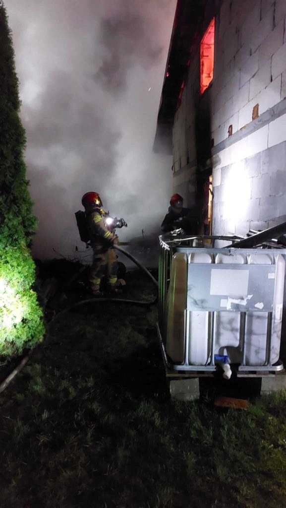 Działania jednostki polegały na zabezpieczeniu miejsca zdarzenia oraz użycia dwóch prądów gaśniczych. Prądy wodne poprowadzono w odległości ponad 400 metrów od miejsca zdarzenia, ze względu na utrudniony dojazd do lokalizacji. Później sprawdzono budynki, gdzie nie znaleziono żadnych osób poszkodowanych. Po ustabilizowaniu akcji gaśniczej, dalsze działania strażaków polegały na przeprowadzeniu niezbędnych prac rozbiórkowych. W akcji wzięło udział 11 zastępów PSP i OSP oraz policja.