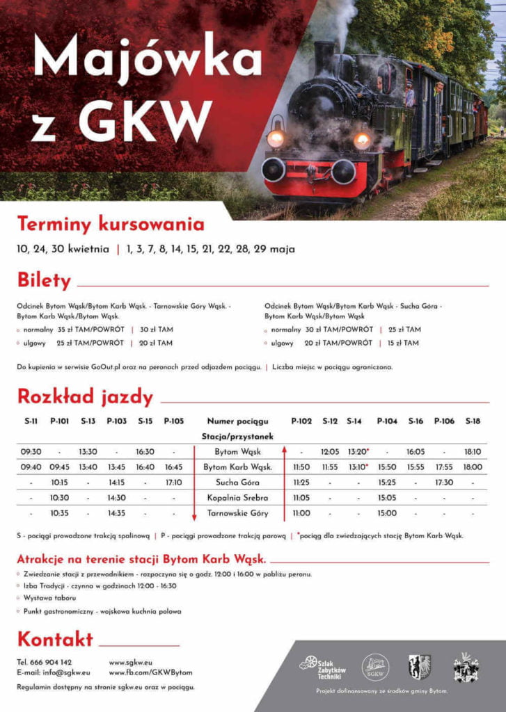 Ważna informacji: Z przyczyn technicznych na odcinku Bytom Wąskotorowy – Bytom Karb Wąskotorowy, wagony będzie ciągnęła lokomotywa spalinowa. Tutaj warto wspomnieć, że wiosenny cykl wąskotorówki kursuje na trasie Bytom Wąskotorowy – Bytom Karb Wąskotorowy – Sucha Góra – Tarnowskie Góry Kopalnia Srebra – Tarnowskie Góry.