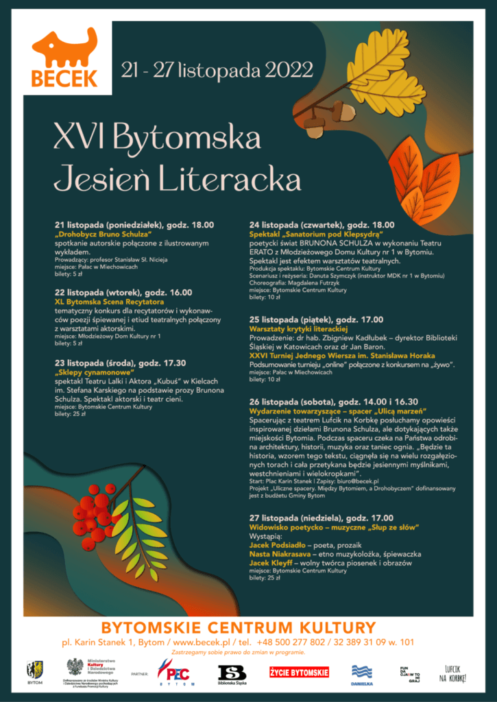 XVI Bytomska Jesień Literacka będzie nawiązywała do postaci Brunona Schulza – pisarza i prozaika pochodzącego z Drohobycza. Festiwal potrwa od 21 do 27 listopada. Organizatorzy przygotowali mnóstwo ciekawych atrakcji między innymi spektakle teatralne, warsztaty krytyki literackiej oraz wyjątkowe widowisko poetycko-muzyczne.