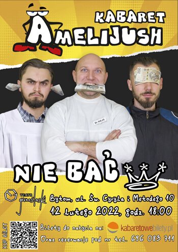 Nastąpiła zmiana terminu występu kabaretu Amelijush z 29 stycznia 2022 na 12 lutego 2022. Program rozpocznie się o godzinie 18:00 w Teatrze Restauracja Old Belford w Łagiewnikach przy ulicy Św. Cyryla i Metodego 10 wystąpi dla was bytomski kabaret Amelijush ze swoim najnowszym programem „Nie bać”.